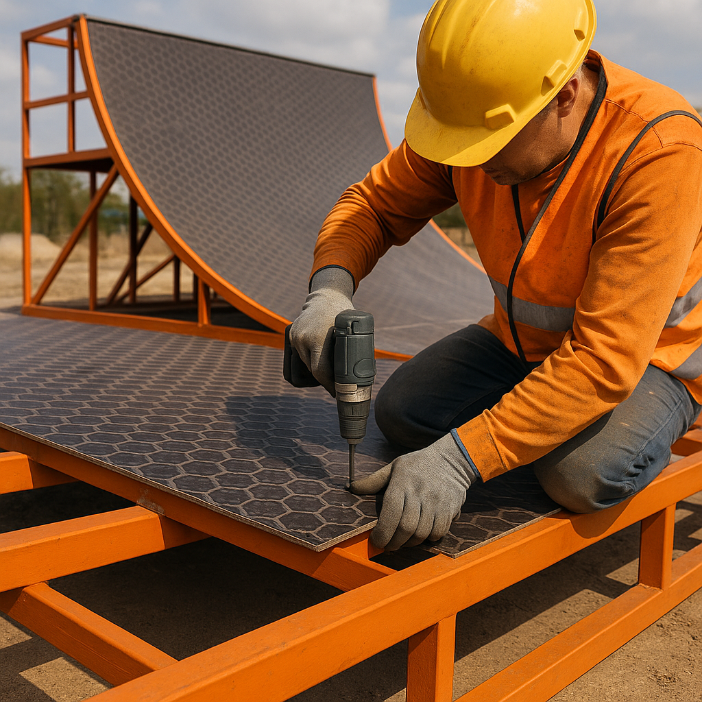 - Фанера (ФСФ, ламинированная) – подходит для крытых скейтпарков, но требует защиты от влаги.
