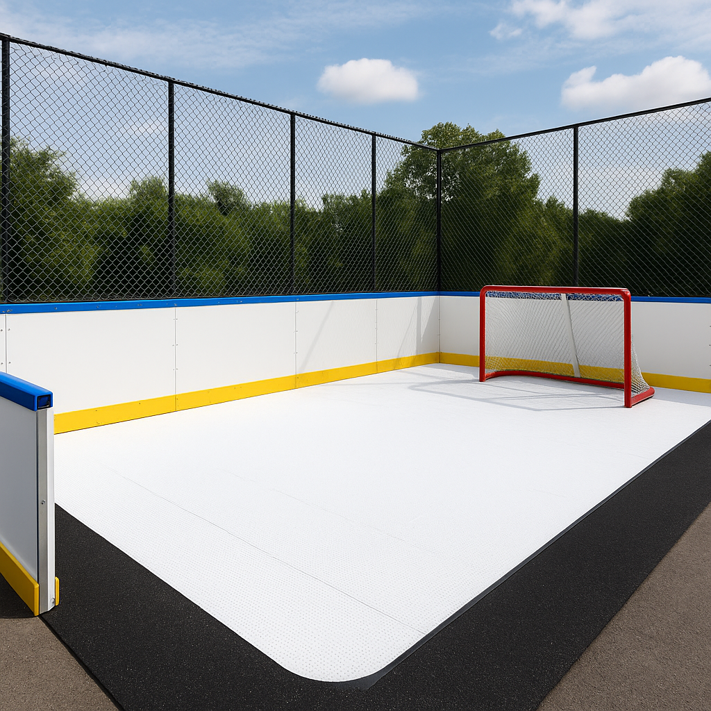 – ПНД (полиэтилен низкого давления) толщиной 8–10 мм — гасит удар шайбы, устойчив к ультрафиолету, морозу и влаге. Подходит для круглогодичного уличного применения.