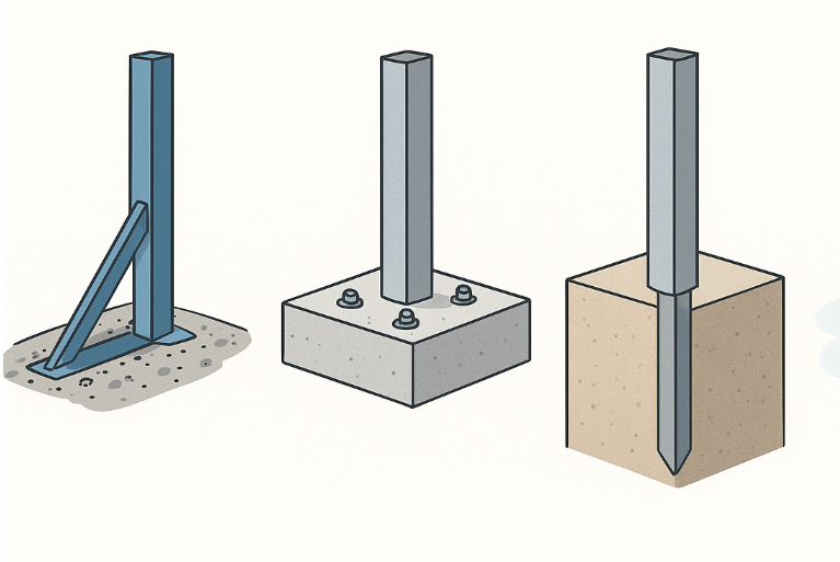 - Заглубляемая часть 500‑700 мм с Т‑образным якорем 100 × 60 × 8 мм для сцепления с бетоном.