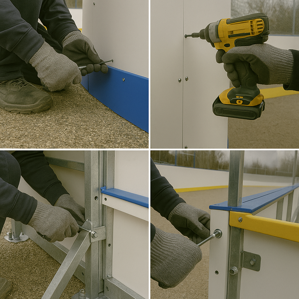 - Монтаж и пуско‑наладка (3–10 дней). По разбивочным чертежам устанавливаются борта и ограждения; анкеры затягиваются до 90 Н·м, выдаётся паспорт ровности (допуск ±4 мм на 10 м).